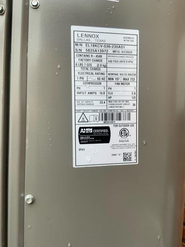 Completed scheduled AC tune-up maintenance on Lennox EL18KCV-036-230A01 outdoor condensing unit (manufactured January 2025) utilizing R-454B refrigerant. Performed comprehensive system inspection, verified electrical specifications at 208/230V single-phase operation, confirmed proper amperage draw within manufacturer specifications, and documented equipment nameplate data for service records.